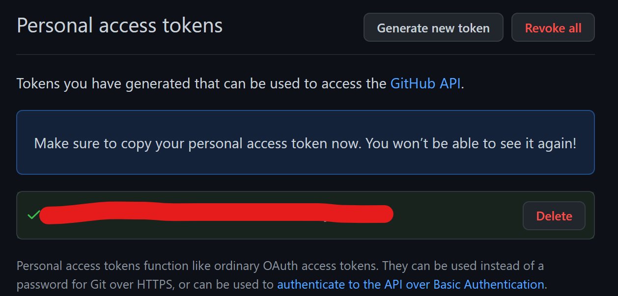 위의 그림과 같이 토큰이 생성되었다. 이 값은 나중에 확인 할 수 없으니 지금 저장해놓아야 한다고 한다!